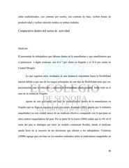 están sindicalizados, con contrato por escrito, con contrato de base, reciben bonos de productividad y reciben atención médica en ambas ciudades. Comparativo dentro del sector de actividad Sindicato El porcentaje de trabajadores que laboran dentro de la manufactura y que manifestaron que sí pertenecen a algún sindicato, son el 6.7 por ciento en Nogales y el 25.8 por ciento en Ciudad Obregón. Lo que sugieren estos resultados es una tendencia importante hacia la flexibilidad laboral debido a que uno de los rasgos principales de este tipo de flexibilidad tiene que ver, precisamente, con la reducción y ausencia de trabajadores sindicalizados. Sobre todo en el caso de la ciudad de Nogales. Aparte de este porcentaje tan bajo de sindicalizados dentro de la manufactura en Nogales que no llega ni siquiera al siete por ciento, Kopinak (2002) apunta que la industria maquiladora en esta ciudad carece de un sindicato efectivo, comparado con lo que pasa en otros centros maquiladores del país. Por su parte De la Garza (2006) señala que la IME en el norte del país se distingue por tener un modelo contractual flexible, donde el sindicato queda fuera de la mayoría de las decisiones que afectan a los trabajadores. Contreras (2000b) agrega que con base en los estudios realizados sobre el sindicalismo maquilador en 99
