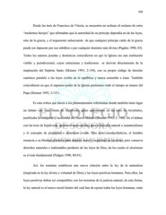 103 Desde las tesis de Francisco de Vitoria, se encuentra un rechazo al reclamo de estos “modernos herejes” que afirmaban que la autoridad de un príncipe dependía no de las leyes, sino de la gracia, y el argumento subsecuente de que cualquier príncipe caído de la gracia puede ser depuesto por sus súbditos o por cualquier dominio más divino (Pagden 1990, 83). Todos los autores jesuitas y dominicos coincidieron en que la Iglesia era una institución visible y jurisdiccional, cuyas estructuras y tradiciones se derivan directamente de la inspiración del Espíritu Santo (Skinner 1993, 2:150), con su propio código de derecho canónico paralelo a las leyes civiles de la república y nunca sometido a éstas. También coincidieron en que el supremo poder de la Iglesia permanece todo el tiempo en manos del Papa (Skinner 1993, 2:151). Es esta crítica que hacen a los planteamientos reformistas donde también tiene lugar un debate con Juan Ginés de Sepúlveda, quien apoyándose en las tesis de Aristóteles, justificaba la conquista y esclavitud del Nuevo Mundo (Skinner 1993, 2: 148). En el debate con las tesis de Sepúlveda, aportaron innovaciones para el derecho natural o iusnaturalismo y el concepto de propiedad o dominium rerum. Para estos neoescolásticos, el hombre renuncia a su libertad primitiva para adquirir moral y seguridad en sociedad, pero conserva derechos naturales e inalienables producto de las leyes de Dios, de los cuales el dominium es el más fundamental (Padgen 1990, 80-81). Así, los tomistas establecen una nueva relación entre la ley de la naturaleza (inspirada en la ley divina y voluntad de Dios) y las leyes positivas humanas. Para ellos, las leyes positivas deben ser compatibles con los teoremas de la justicia natural; de esta forma, la ley natural es el marco moral dentro del cual han de operar todas las leyes humanas, estas