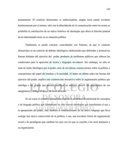 114 pensamiento. El contexto skinneriano es antitextualista, ningún texto puede revelarse históricamente por sí mismo, sólo con la dilucidación de la comunicación entre los textos se posibilita la construcción de un marco histórico de ideologías que ubica la función puntual de un determinado texto en su situación política. Finalmente se puede concluir, coincidiendo con Palonen, de que el contexto skinneriano es un contexto de debates ideológicos intelectuales que defienden y promueven formas distintas del ejercicio del poder, producto de problemas políticos que ofrecen las condiciones para la aparición de textos y lenguajes novedosos. Sin embargo, no sólo se trata de lucha ideológica por el poder, sino de novedosas cosmovisiones sobre la política y concepciones del papel del hombre y la sociedad. Al haber un debate sobre las formas del ejercicio del poder, implica una construcción discursiva sobre la organización política que satisfaga a los grupos que quieren justificar su ascenso, socave los argumentos de sus antagónicos y atraiga el apoyo de otros sectores. Es así como el contexto skinneriano implica la construcción intelectual de conceptos y de lenguaje político que fundamente no sólo nuevas ideologías que transformen el uso y la apropiación del poder, sino también el establecimiento de un nuevo lenguaje que lleva consigo una nueva cosmovisión de la política; o sea, una novedosa forma de organización social y de paradigmas que cambien los ojos con los que se concibe a los seres humanos y su organización.