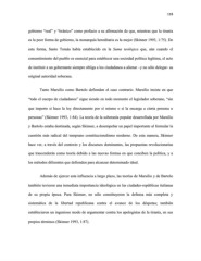 118 gobierno “real” y “tiránico” como prefacio a su afirmación de que, mientras que la tiranía es la peor forma de gobierno, la monarquía hereditaria es la mejor (Skinner 1993, 1:75). De esta forma, Santo Tomás había establecido en la Suma teológica que, aún cuando el consentimiento del pueblo es esencial para establecer una sociedad política legítima, el acto de instituir a un gobernante siempre obliga a los ciudadanos a alienar –y no sólo delegar- su original autoridad soberana. Tanto Marsilio como Bartolo defienden el caso contrario. Marsilio insiste en que “todo el cuerpo de ciudadanos” sigue siendo en todo momento el legislador soberano, “sin que importe si hace la ley directamente por sí mismo o si la encarga a cierta persona o personas” (Skinner 1993, 1:84). La teoría de la soberanía popular desarrollada por Marsilio y Bartolo estaba destinada, según Skinner, a desempeñar un papel importante al formular la cuestión más radical del temprano constitucionalismo moderno. De esta manera, Skinner hace ver, a través del contexto y los discursos dominantes, las propuestas revolucionarias que trascenderán como teoría debido a las nuevas formas en que conciben la política, y a los métodos diferentes que defienden para alcanzar determinado ideal. Además de ejercer esta influencia a largo plazo, las teorías de Marsilio y de Bartolo también tuvieron una inmediata importancia ideológica en las ciudades-repúblicas italianas de su propia época. Para Skinner, no sólo constituyeron la defensa más completa y sistemática de la libertad republicana contra el avance de los déspotas; también establecieron un ingenioso modo de argumentar contra los apologistas de la tiranía, en sus propios términos (Skinner 1993, 1:87).