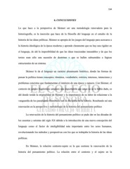 134 6. CONCLUSIONES Lo que hace a la perspectiva de Skinner ser una metodología renovadora para la historiografía, es la inserción que hace de la filosofía del lenguaje en el estudio de la historia de las ideas políticas. Skinner se apropia de los juegos del lenguaje para acercarse a la historia ideológica de la época moderna y aprende claramente que no hay una rigidez en el lenguaje, de ahí la imposibilidad de que las ideas trasciendan inmutables y de que los textos sean sólo una sucesión de doctrinas o que se hallen subsumidos a lógicas estructurales de un sistema. Skinner le da al lenguaje un carácter plenamente histórico, donde las formas de pensar la política tienen conceptos, términos, vocabulario, retórica, intereses, intenciones y problemas concretos que fundamentan el intelecto de una época y espacio. Con Skinner, el contexto de juegos lingüísticos adquiere una importancia que antes no se le había dado, es ahí donde reside la originalidad de Skinner y la importancia de su labor de relacionar a la vanguardia de los paradigmas filosóficos con la disciplina de la historia. Resultando así una renovación en la perspectiva y metodología de la historia del pensamiento político La renovación de la historia del pensamiento político se pudo dar en las décadas de los sesentas y setentas del siglo XX debido a la introducción de una nueva concepción del lenguaje como el factor de inteligibilidad más importante entre los seres humanos, revolucionando los métodos y perspectivas con los que se trabajaba la historia de las ideas políticas. En Skinner, la relación contexto-sujeto es la que sostiene la renovación de la historia del pensamiento político. La relación entre el contexto y el sujeto en la