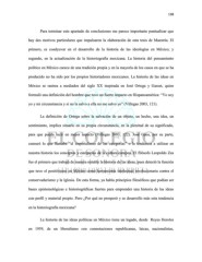 138 Para terminar este apartado de conclusiones me parece importante puntualizar que hay dos motivos particulares que impulsaron la elaboración de esta tesis de Maestría. El primero, es coadyuvar en el desarrollo de la historia de las ideologías en México; y segundo, en la actualización de la historiografía mexicana. La historia del pensamiento político en México carece de una tradición propia y en la mayoría de los casos en que se ha producido no ha sido por los propios historiadores mexicanos. La historia de las ideas en México se rastrea a mediados del siglo XX inspirada en José Ortega y Gasset, quien formuló una definición del hombre que tuvo un fuerte impacto en Hispanoamérica: “Yo soy yo y mi circunstancia y si no la salvo a ella no me salvo yo” (Villegas 2003, 121). La definición de Ortega sobre la salvación de un objeto, un hecho, una idea, un sentimiento, implica situarlo en su propia circunstancia, en la plenitud de su significado, para que pueda lucir en mejor aspecto (Villegas 2003, 122). José Gaos, por su parte, censuró lo que llamaba “el imperialismo de las categorías” o la tendencia a utilizar en nuestra historia los conceptos y categorías de la cultura europea. El filósofo Leopoldo Zea fue el primero que trabajó de manera notable la historia de las ideas, pues detectó la función que tuvo el positivismo en México como herramienta intelectual revolucionaria contra el conservadurismo y la Iglesia. De esta forma, ya había principios filosóficos que podían ser bases epistemológicas e historiográficas fuertes para emprender una historia de las ideas con perfil y material propio. Pero ¿Por qué no prosperó y se desarrollo más esta tendencia en la historiografía mexicana? La historia de las ideas políticas en México tiene un legado, desde Reyes Heroles en 1959, de un liberalismo con connotaciones republicanas, laicas, nacionalistas,