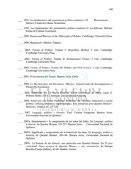 148 ___. 1993. Los fundamentos del pensamiento político moderno I. El Renacimiento. México: Fondo de Cultura Económica. ___. 1993. Los fundamentos del pensamiento político moderno II. La Reforma. México: Fondo de Cultura Económica. ___. 1996. Reason and Rhetoric in the Philosophy of Hobbes. Cambridge: University Press. ___. 2000. Maquiavelo. México: Alianza. ___. 2002. Visions of Politics. Volume I: Regarding Method. 3 vols. Cambridge: Cambridge University Press. ___. 2002. Visions of Politics. Volume II: Rennaissance Virtues. 3 vols. Cambridge: Cambridge University Press. ___. 2002. Visions of Politics. Volume III: Hobbes and Civil Science. 3 vols. Cambridge: Cambridge University Press. ___. 2003. El nacimiento del Estado. Buenos Aires: Gorla. ___. 2004. La libertad antes del liberalismo. México : Taurus/Centro de Investigaciones y Desarrollo Económico. ___. 2005. Entrevista. En La Nueva Historia. Nueve entrevistas, de Maria Lúcia G. Pallares-Burke, 255-82. Granada: Universidad de Granada. ___. 2006. Entrevista con Javier Fernández Sebastián. En “Historia intelectual y acción política: retórica, libertad y republicanismo. Una entrevista con Quentin Skinner”. Historia y Política.16: 237-258. ___. 2007. Lenguaje, política e historia. Trad. Cristina Fangmann. Buenos Aires: Universidad Nacional de Quilmes. ___. 2007a. Interpretación y la comprensión de los actos del habla. En Lenguaje, política e historia, de Quentin Skinner, 185-222. Buenos Aires: Universidad Nacional de Quilmes. ___. 2007b. Significado y comprensión de la historia de las ideas. En Lenguaje, política e historia, de Quentin Skinner, 109-164. Buenos Aires: Universidad Nacional de Quilmes. ___. 2007c. La historia de mi historia: una entrevista con Quentin Skinner. En El giro contextual. Cinco ensayos de Quentin Skinner, y seis comentarios, de Enrique Bocardo Crespo (Editor), 45-60. Madrid: Tecnos.