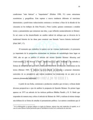 19 condiciones “más básicas” o “importantes” (Richter 1990, 51) como estructuras económicas y geográficas. Esta ruptura o nueva tendencia diferente al marxismo determinista y positivismo reduccionista comienza a revelarse a fines de la década de los cincuenta en los trabajos de John Pocock y Peter Laslett, quienes comienzan a estudiar textos y pensamientos que enmarcan una idea, y que influirán sustancialmente en Skinner. Es así como se fue desarrollando un cambio radical de enfoque que se divorcia de la tradicional historia de las ideas para construir una llamada “nueva historia intelectual” (Palti 2007, 17). El momento que simboliza la ruptura con las visiones tradicionales y la presencia ya importante de la perspectiva skinneriana en términos de metodología tiene lugar en 1969, año en que se publica el artículo del mismo Quentin Skinner: Meaning and 1 Understanding in the History of Ideas , donde hace una crítica profunda a los métodos y formas de interpretar por parte de la tradicional historia de las ideas por concentrase en los textos (Skinner 1969, 7). Además, en este artículo ya comienza a proponer elementos esenciales de su perspectiva que intenta encontrar las intenciones de un autor en un contexto plenamente intelectual. A partir de esa fecha, comienzan a producirse estudios que revisan y critican desde diversas perspectivas o ejes de análisis la propuesta de Quentin Skinner. En primer lugar aparece en 1973 un artículo de los teóricos políticos Bhikhu Parekh y R. N. Berki que responden de manera muy crítica el artículo de Skinner de 1969 y realizan al mismo tiempo una defensa de su forma de estudiar el pensamiento político. Los autores consideran que el 1 En la bibliografía se agregan trabajos en inglés de Skinner, algunos han sido traducidos al español, en el caso de estos últimos fueron preferidos para la facilidad de lectura en la realización de esta tesis.