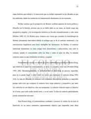 21 etapa histórica que trabajó y la innovación que su trabajo representó en las décadas en que fue publicado, dadas las tendencias de interpretación dominantes en ese momento. Richter sostiene que la perspectiva de Skinner combina aspectos de teoría política y filosofía con la historia, proceso que no se había dado en ese ramo, en donde surge una perspectiva singular y de investigación histórica no llevada sistemáticamente a cabo antes (Richter 1990, 67). En Richter pues, tenemos una visión que considera la metodología de Skinner plenamente innovadora debido al enfoque que se da al contexto intelectual y las convenciones lingüísticas para hacer inteligible las intenciones. En Richter, el contexto intelectual skinneriano no tiene ningún tinte determinista o reduccionista, sino todo lo contario, amplia el conocimiento sobre las ideas y sobre el autor de ellas, la relación contexto-sujeto es aquí totalmente novedosa y singular. Posteriormente aparece un estudio de crítica metodológica escrito por Preston King, que relativiza el papel del contextualismo, es decir, lo considera como una obviedad (King 1995, 209). Metodológicamente, el contextualismo es para King un proceso imposible, pues no se puede llegar a cubrir todos los textos que impliquen el contexto (King 1995, 210). La idea de dilucidar un contexto con evidencias descriptivas primarias es imposible porque cada texto que compone el contexto tiene carga subjetiva y propositiva, por tanto los contextos no son objetivos, sino son propuestas. La relación contexto-sujeto se disuelve en el texto, pues todo acaba siendo texto, y es así como la idea de contexto prácticamente pierde connotación relevante. Para Preston King, el contextualismo confunde y oscurece la validez de un texto al disolverlo en un marco normativo supuestamente objetivo que impondría otras ideas