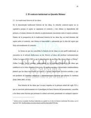 25 2. El contexto intelectual en Quentin Skinner 2.1. La tradicional historia de las ideas. En la denominada tradicional historia de las ideas, la relación contexto-sujeto no es equitativa porque el sujeto se superpone al contexto y éste último es dependiente del primero, el mismo término de relación es prácticamente inexistente entre el sujeto-contexto. Dentro de la perspectiva de la tradicional historia de las ideas hay un total dominio del sujeto sobre el contexto, este último es trascendido y subsumido por la idea del sujeto que forja universalmente al contexto. La forma en que era concebida la historia de las ideas en este perfil tradicional, se encuentra en el artículo Reflections on the History of Ideas del profesor norteamericano 3 Arthur Lovejoy (1873-1962) y en la Introducción de su libro The Great Chain of Being . Arthur Lovejoy fue el máximo representante de la tradicional historia de las ideas que estableció en la Johns Hopkins University. En ambos escritos, el historiador estadounidense planteó que las ideas trascienden en espacio y tiempo adquiriendo diversos sentidos, y que son producto de impulsos subjetivos o determinaciones objetivas que afectan la conducta (Palti 2004-2005, 65-66). Esta historia de las ideas que Lovejoy impulsa en la primera mitad del siglo XX y que se convierte prácticamente en el paradigma de hacer historia del pensamiento, concebía a las ideas como fuerzas que permean la cultura universal, penetrando en cualquier espacio- 3 Ambos textos se pueden localizar traducidos en español en el sitio de historia intelectual Iberoideas con el siguiente link: foroiberoideas.cervantesvirtual.com/foro/data/adm55524.doc