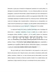 35 historiador es quien pone al desnudo los fundamentos materiales de la acción política. La ideología no era material vital para la historia. A su vez, el discurso político era visto como propaganda y construcción distorsionada, cualquier historiador que tocara mínimamente la cuestión retórica y la persuasión pública era débil en sus argumentos (Goldie 2006, 5). Para el paradigma anglosajón de mediados del siglo XX, el discurso privado o individual estaba exento de la ideología; todo el material político e intelectual que no correspondiera a un cuerpo textual de pensamiento que se adaptase a las ideas globales institucionalizadas de la historia, era discriminado por ser una “alteración” y “desfiguración” de la realidad. La tradicional historia de las ideas es también denominada como el paradigma del behaviorismo o empirismo conductista, ya que se trataba de un modelo donde la investigación debería describrir y explicar y, de ser posible, predecir los fenómenos políticos en términos exclusivamente empíricos, evitando todo juicio evaluativo (Velasco 1995, 14). Los defensores de este paradigma terminan justificando el actual estado de cosas políticas (Velasco 1995, 15). Esta visión empírista busca conocimiento comprobable y respaldado por la experiencia, donde los juicios y valores estén excluidos, y la descripción y explicación objetiva sean el producto ideal de toda investigación. Hay que resaltar que la idea de historicidad en esta perspectiva es nula, pues la historia como proceso corto o largo de sucesos, como contexto, circunstancia, medio social, político, económico, cultural, etc., no tiene relevancia para las ideas-unidad, ya que éstas últimas imponen a la historia su forma de concebir al mundo. No se estudia historia, sino simplemene, la lógica natural de la idea que va encontrando diversos autores sustitutos.