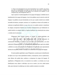 43 11. Piensa en las herramientas de una caja de herramientas: hay un martillo, unas tenazas, una sierra, un destornillador, una regla, un tarro de cola, cola, clavos y tornillos. Tan diversas como las funciones de estos objetos son la funciones de las palabras. (Y hay semejanzas aquí y allí) (Wittgenstein 2003, 27). Aquí se aprecia el sentido pragmático de los juegos del lenguaje, la utilidad como la manifestación de los juegos del lenguaje, el uso de las palabras como la razón de existir del lenguaje. Las palabras son pues herramientas con las que se puede construir una variedad incontable de términos, conceptos, oraciones, etc. Las palabras no tienen un fin acabado, no contienen un significado definitivo ya que, de ser así, no se podría construir o transformar las antiguas concepciones históricas por novedosas interpretaciones que fundamenten un cambio histórico en cualquier ámbito, ni siquiera tendríamos una comunicación tan extensa y variada como la conocemos. Wittgenstein llama lenguaje primitivo al lenguaje de palabra-significado, una asociación cabal de palabra y objeto (Wittgenstein 2003, 19). Es una especie de comunicación sistemática. Su empleo se da en la niñez como adiestramiento y no como explicación (Wittgenstein 2003, 10). La búsqueda del significado como aquel ente acabado y definitivo no existe en la perspectiva de Wittgenstein. El significado como representación absoluta de una palabra, término o concepto, no se manifiesta en los juegos del lenguaje. El asociar palabra-significado es para Wittgenstein, un primer paso de identificación de objetos con el que vamos aprendiendo nombres y descripciones, más no explicaciones, estas últimas sólo podrán darse conforme se enriquezcan los juegos del lenguaje. El significado en Wittgenstein sólo es la mención de un nombre o un término con el que identificamos cosas, objetos o individuos, cuyo uso es común y nos sirve, desde nuestra niñez, para relacionar la realidad que nos rodea y poderla comunicar en sociedad.