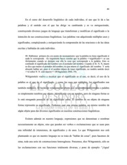 44 En el curso del desarrollo lingüístico de cada individuo, el uso que le da a las palabras y el sentido con el que las dirige va cambiando y se va enriqueciendo, construyendo diversos juegos de lenguaje que transforman y modifican el significado o la intención de sus construcciones lingüísticas. Las palabras van adquiriendo múltiples usos y significados, complejizando y enriqueciendo la comprensión de las oraciones o de las ideas escritas y habladas de cada individuo. 40. Hablemos primero de este punto de razonamiento: que la palabra no tiene significado si nada le corresponde. –Es importante hacer constar que la palabra <> se usa ilícitamente cuando se designa con ella la cosa que corresponde a la palabra. Esto es confundir el significado del nombre con el portador del nombre. Cuando el Sr. N. N, muere se dice que muere el portador del nombre, no que muere el significado del nombre. Y sería absurdo hablar así, pues si el nombre dejara de tener significado, no tendría sentido decir <> (Wittgenstein 2003, 59). Wittgenstein vuelve a recalcar que el significado es el uso, es decir, el uso de la palabra es el que da el significado, y como los usos son múltiples, los significados son también múltiples. El hecho de relacionar un objeto con un determinado término o palabra es simplemente nombrar ese objeto, identificarlo con un nombre, pero de ninguna forma se le está otorgando posesión de un significado cabal. El nombre de un objeto de ninguna forma representa su significado. Podemos usar una misma palabra, un mismo nombre de algún objeto para dar diversos significados en nuestras construcciones lingüísticas. Existen además en nuestro lenguaje, expresiones que no denominan o nombran necesariamente un objeto, sino que pueden ser verbos o exclamaciones que se usan para una infinidad de intensiones, de significados y de usos. Lo que Wittgenstein nos está planteando es que en nuestro lenguaje no se trata de “hablar de cosas”, pues hacemos de estas, toda una serie de construcciones heterogéneas. Pensemos, dice Wittgenstein, sólo en las exclamaciones con sus funciones totalmente diversas, y pone de ejemplo: “¡Agua!
