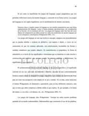 46 Es así como se manifiestan los juegos del lenguaje, juegos pragmáticos que nos permiten reflexionar acerca de nuestro lenguaje y conocerlo en su forma activa. Los juegos del lenguaje no son reglas lingüísticas, son la manifestación de nuestra conciencia. Nuestros claros y simples juegos de lenguaje no son estudios preparatorios para una futura reglamentación del lenguaje –como si fueran primeras aproximaciones, sin consideración de la fricción y de la resistencia del aire. Los juegos del lenguaje están más bien ahí como objetos de comparación que deben arrojar luz sobre las condiciones de nuestro lenguaje por vía de semejanza y desemejanza (Wittgenstein 2003, 131). Los juegos del lenguaje no son una teoría ni concepto, tampoco son procedimientos que se pueden detallar o explicar en definitiva. Los usamos a diario, a veces sin ser conscientes de que los estamos aplicando, son prácticamente incontables las formas y sentidos semánticos que pueden adquirir. Su manifestación es pragmática, la forma de entenderlos es a través de los significados e intensiones que se muestran en cada oración o construcción con palabras que, aunque usando las mismas palabras o definiciones, los significados y usos cambian. El esclarecimiento de un juego del lenguaje, o sea, su uso específico y el significado concreto de ese uso, así como su intensión y objetivo, necesita de una contextualización histórica amplia donde se despejen los juegos lingüísticos que rodean una determinada frase para así tener una perspectiva más amplia de su uso y sentido. No se trata, como menciona el mismo Wittgenstein, de dominarlo o aprenderlo, pues no hay definición ostensiva, sino que se tiene que saber conjeturar a dónde señala el que explica. Si, por ejemplo, a la forma del objeto, o a su color, o al número, etc., etc. (Wittgenstein 2003, 51). Los juegos del lenguaje, dice Wittgenstein: “Arrojan luz sobre nuestro problema quitando de en medio malentendidos. Malentendidos que conciernen al uso de las palabras,