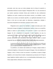 47 provocados, entre otras cosas, por ciertas analogías entre las formas de expresión en determinados dominios de nuestro lenguaje” (Wittgenstein 2003, 113). Ser conscientes de que nuestras expresiones racionales forman parte inevitable de estas combinaciones lingüísticas nos ayuda a entender que todo producto racional, ya sea hablado o escrito, implica un uso concreto, una intensión específica y un significado determinado. De esta forma se evita errar con mayor grado, las alteraciones, comparaciones, analogías o desviaciones interpretativas de enunciados o productos escritos u orales. Wittgenstein está en contra de las totalidades y verdades universales, pues si todo forma parte de juegos de lenguaje, los planteamientos cambian y tienen un uso específico; además, la manera en como pensamos y nos acercamos a conocer es por medio del lenguaje. De ahí la importancia de comprender el medio lingüístico, los usos, los significados, y el sentido en los que un sujeto sustentó su producción intelectual, antes de pretender universalizar cierto conocimiento sobre alguna realidad u objeto, es esencial comprender bajo qué múltiples connotaciones estuvo inmerso determinado pensamiento. La presencia del método experimental nos hace creer que ya disponemos de los medios para librarnos de los problemas que nos inquietan; cuando en realidad problemas y métodos pasan de largo sin encontrarse. (Wittgenstein 2003, 527) Los problemas y los métodos están mediados por el lenguaje, cualquier método es construcción lingüística y forma parte de los juegos del lenguaje. Todo está mediado por el lenguaje, es decir, la forma en cómo nos acercamos a un problema ya supone un bagaje lingüístico y de la misma forma el estudio e interpretaciones que hacemos de él. El tipo de juegos lingüísticos también cambian de uso y van transformándose históricamente, de esa forma, ningún método o afirmación es eterna ni absoluta.