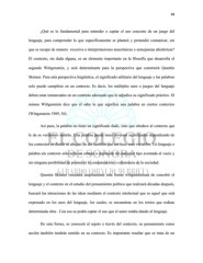 48 ¿Qué es lo fundamental para entender o captar el uso concreto de un juego del lenguaje, para comprender lo que específicamente se planteó y pretendió comunicar, sin que se escape de manera excesiva a interpretaciones anacrónicas o semejanzas ahistóricas? El contexto, sin duda alguna, es un elemento importante en la filosofía que desarrolla el segundo Wittgenstein, y será determinante para la perspectiva que construirá Quentin Skinner. Para esta perspectiva lingüística, el significado utilitario del lenguaje y las palabras solo puede cumplirse en un contexto. Es decir, los múltiples usos o juegos del lenguaje deben estar enmarcados en un contexto adecuado que le adjudica su significado práctico. El mismo Wittgenstein dice que él sabe lo que significa una palabra en ciertos contextos (Wittgenstein 1989, 36). Así pues, la palabra no tiene un significado dado, sino que obedece al contexto que le da su verdadero sentido. Una palabra puede tener diversos significados dependiendo de los contextos en donde se ubique, de ahí también que sus usos sean variables. Un lenguaje o palabra sin contexto sólo sería un sonido o expresión de cualquier tipo aventada al vacío y sin ninguna posibilidad de promover la comunicación o coherencia en la sociedad. Quentin Skinner rescatará ampliamente esta forma wittgenstiniana de concebir el lenguaje y el contexto en el estudio del pensamiento político que realizará décadas después, buscará las intenciones de las ideas mediante el contexto intelectual que es aquel que está expresado en los usos del lenguaje, los cuales, se encuentran en los textos que rodean determinada obra . Con eso se podrá captar el uso que el autor estaba dando al lenguaje. De esta forma, se conocerá al sujeto a través del contexto, su pensamiento como acción también tendrán sentido en su contexto. Es importante resaltar que se trata de un