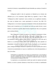 53 creación de la historia es responsabilidad del sujeto-historiador que construye el mundo de las ideas. Collingwood cambió la idea de experiencia en Oakeshott por un término más elaborado que es el de consciencia. Según Martin Jay, siguiendo a Louis O. Mink: “Collingwood no utilizó ‘experiencia’ como un término con un significado sistemático, sino como un sinónimo más o menos aproximado de conciencia” (Jay 2009, 275). Collingwood no ve en la idea de experiencia de Oakeshott, la forma más adecuada de hacer historia, pues la experiencia en sí no representa una acción que pueda elevarse a suceso histórico, la experiencia la pueden adquirir diversos organismos de vida y eso no garantiza que se construya historia. Para Collingwood, la historia no puede ser un conjunto de experiencias en bruto, pues debe haber consciencia reflexiva de por medio, experiencia pensada que haga que toda esa acumulación empírica adquiera sentido histórico. Collingwood ya tenía claro que la historia no se presenta en materia prima como experiencias que están esperando ser interpretadas, la historia nos llega por medio de ideas ya pensadas y no de experiencias puras. Collingwood distingue claramente la experiencia de la idea, la primera sólo como la vivencia de un acontecimiento en sí que no se manifiesta sino a través del pensamiento, es decir, de las ideas. El historiador no se queda jamás con un aspecto con exclusión del otro. Lo que investiga no son meros acontecimientos (por mero acontecimiento quiero decir uno que sólo tiene exterior y no interior), sino acciones, y una acción es la unidad del exterior y el interior de un acontecimiento (Collingwood 2000, 209). La experiencia es un acontecimiento exterior que sucede sin expresar una lección histórica, su acción se presenta solamente en forma física sin revelarse su manifestación