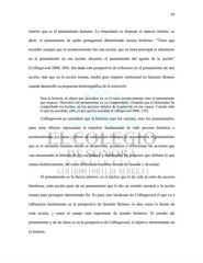 54 interior que es el pensamiento humano. Lo importante es despejar el aspecto interior, es decir, el pensamiento de quién protagonizó determinado suceso histórico. “Tiene que recordar siempre que el acontecimiento fue una acción, que su tarea principal es adentrarse en el pensamiento en esa acción, discernir el pensamiento del agente de la acción” (Collingwood 2000, 209). Sin duda esta perspectiva de enfocarse en el pensamiento de una acción, más que en la acción misma, tendrá gran impacto intelectual en Quentin Skinner cuando desarrolle su propuesta historiográfica de la intención. Para la historia, el objeto por descubrir no es el mero acontecimiento sino el pensamiento que expresa. Descubrir ese pensamiento es ya comprenderlo. Después que el historiador ha comprobado los hechos, no hay proceso ulterior de inquisición en sus causas. Cuando sabe lo que ha sucedido, sabe ya por qué ha sucedido (Collingwood 2000, 210). Collingwood no considera que la historia sean los sucesos, sino los pensamientos, pues estos últimos representan el impulsor fundamental de todo proceso histórico o acontecimiento. La causa y efecto de toda acción histórica se encuentra en el pensamiento que es el elemento humano donde se desarrollan, producen y reflexionan las acciones que van encausando la historia de las sociedades y moldeando los procesos que definen lo que somos históricamente, así como definiendo nuestras formas de razonar y de actuar. El pensamiento es la fuerza interior, es el núcleo que le da vida al resto de sucesos históricos, toda acción parte de un pensamiento que le dio un sentido racional a la acción misma para perseguir determinado fin. Es pues este idealismo de Collingwood el que va a influenciar fuertemente en la perspectiva de Quentin Skinner, la idea como la fuente de toda acción, y como el campo más importante de estudio histórico. El estudio del pensamiento y de las ideas es en la perspectiva de Collingwood, el objetivo determinante de la historia.