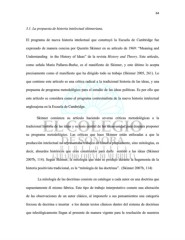64 3.1. La propuesta de historia intelectual skinneriana. El programa de nueva historia intelectual que construyó la Escuela de Cambridge fue expresado de manera concisa por Quentin Skinner en su artículo de 1969: “Meaning and Understanding in the History of Ideas” de la revista History and Theory. Este artículo, como señala Maria Pallares-Burke, es el manifiesto de Skinner, y este último lo acepta precisamente como el manifiesto que ha dirigido todo su trabajo (Skinner 2005, 261). Lo que contiene este artículo es una crítica radical a la tradicional historia de las ideas, y una propuesta de programa metodológico para el estudio de las ideas políticas. Es por ello que este artículo se considera como el programa contextualista de la nueva historia intelectual anglosajona en la Escuela de Cambridge. Skinner comienza su artículo haciendo severas criticas metodológicas a la tradicional historia de las ideas y su tesis central de las ideas-unidad para después proponer su programa metodológico. Las críticas que hace Skinner están enfocadas a que la producción intelectual no representaba trabajos de historia propiamente, sino mitologías, es decir, absurdos históricos que eran construidos para darle sentido a las ideas (Skinner 2007b, 114). Según Skinner, la mitología que más se produjo durante la hegemonía de la historia positivista tradicional, es la “mitología de las doctrinas”. (Skinner 2007b, 114) La mitología de las doctrinas consiste en catalogar a cada autor en una doctrina que supuestamente él mismo fabrica. Este tipo de trabajo interpretativo comete una alteración de las observaciones de un autor clásico, al imponerle a sus pensamientos una categoría forzosa de doctrina e insertar a los demás textos clásicos dentro del sistema de doctrinas que teleológicamente llegan al presente de manera vigente para la resolución de nuestros
