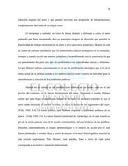 73 intención original del autor y que pueden provocar una progresión de interpretaciones completamente desviadas de su origen veraz. El interpretar o entender un texto de forma distante y diferente a como el autor pretendió que fuera interpretada, abre un panorama riesgoso de discusión que perturba la historicidad del trabajo intelectual de un autor y sirve para otros propósitos. Skinner no está en contra de retomar enseñanzas que los intelectuales clásicos produjeron en su momento, siempre y cuando sea de una manera cuidadosa e invariablemente con la conciencia de que ese pensamiento fue para otro tipo de problemática con especificades únicas y diferentes. Lo que Skinner rechaza concretamente es el uso de justificación ideológica que se le da al status actual de la política usando a los autores clásicos como voceros de autoridad para el entendimiento y solución de los problemas políticos. Skinner no se enfoca en las posibles tesis teóricas de los textos, sino en el uso preciso del contexto, en la fuerza ilocucionaria del autor. Siguiendo a Austin, Skinner asume que para llegar al significado íntegro de un texto, es necesario entender lo que el autor estaba haciendo al escribir su texto, es decir la fuerza de los argumentos del autor. (Tully 1989, 8-9). La teoría política, para Skinner, responde a problemas políticos de su época. (Tully 1989, 10). La nueva historia intelectual de Cambridge, no es una escuela en pro de la teoría general, sino de la acción contextualista, del uso histórico de las palabras. Descifrar contextualmente el origen epistemológico y el motivo de acción por el cuál fueron planteadas o creadas ideas y textos de autores es la tarea historiográfica esencial de esta escuela anglosajona. Para Skinner, cada palabra, frase o texto de cada autor corresponde a un motivo e intención determinado.