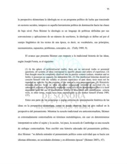 75 la perspectiva skinneriana la ideología no es un programa político de lucha que trasciende en sectores sociales, tampoco es aquella herramienta política de dominación hacia las clases de bajo nivel. Para Skinner la ideología es un lenguaje de políticas definidas por sus convenciones y aplicaciones de un número de escritores, la ideología se define así por el cuerpo lingüístico de los textos de una época, es decir, su vocabulario, sus principios, razonamientos, supuestos, problemas, conceptos, etc. (Tully 1989, 9). El avance que presenta Skinner con respecto a la tradicional historia de las ideas, según Joseph Femia, es el siguiente: (1) In the sphere of political/social reality, there are no universal truths or perennial questions; all systems of ideas correspond to specific phases and orders of experience. (2) Past thought must be completely disolved into its precise context (culture, situation and so forth); it possesses no capacity for indepedent life. (3) The intellectual historian should not concern himself with the validity or present signicance of past ideas; texts must not be regarded as vehicles for the exercise of the analyst’s own preoccupations. (4) Historicity demands that we focus on what an author consciously intended to say. And (5), no subsequent account of a thinker’s enterprise could survive the demonstration that it is itself dependent upon the use of anachronistic criteria of description and classification –criteria wich, in other terms, would have been unintelligible to the thinker himself (Femia 1989, 157). Estos son parte de los principios o reglas estrictas de interpretación histórica de las ideas en la perspectiva skinneriana, como se puede observar, hay un giro radical en la perspectiva del pensamiento. Mientras la escuela tradicional era anticontextualista, Skinner es extremadamente contextualista en términos metodológicos, sin caer en determinismos interpretativos sobre el sujeto y la acción. Así pues, la escuela de Cambridge es una escuela de enfoque contextualista. Para escribir una historia adecuada del pensamiento político, dice Skinner: “se debería entender el pensamiento político como actividad que se hacía con idiomas diferentes, en sociedades distintas y en diferentes épocas” (Skinner 2007c, 47).