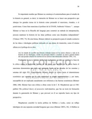78 Es importante resaltar que Skinner no construye el contextualismo para el estudio de la historia en general, es decir, la intención de Skinner no es hacer una perspectiva que abarque los grandes temas de la historia como pretendió el marxismo, Annales, o el positivismo. Como bien menciona el profesor de la UNAM, Ambrosio Velasco: “…aunque Skinner se basa en la filosofía del lenguaje para construir un método de interpretación, procura mantener la historia de las ideas políticas como una disciplina independiente” (Velasco 1995, 73). De esta forma, Skinner elaboró su perspectiva para el estudio exclusivo de las ideas e ideologías políticas enfocado en una época de transición, como él mismo afirma en el prólogo de su obra: Así, he tratado de escribir una historia centrada menos en los textos clásicos y más en la historia de las ideologías, siendo mi principal objetivo construir un marco general dentro del cual puedan situarse los escritos de los teóricos más destacados (Skinner 1993, 1:9). Finalmente la nueva historia intelectual anglosajona no sólo se construyó a base de la crítica contra la tradicional historia de las ideas, sino también en la crítica hacia el marxismo determinista que tenía una presencia fuerte en las décadas de los sesentas y setentas del siglo XX. Especialmente Skinner dirigió su crítica hacia el determinismo económico que suponía que la vida intelectual es simple superestructura y, por tanto, susceptible de ser explicada causalmente con referencia a las fuerzas económicas (Skinner 2006, 240). Skinner hace una críitica a obras como la de C. B. Macpherson que en 1961 publicó The political theory of possessive individualism, que fue un texto de formación durante la generación de Skinner y que provocó en él un reproche hacia ese tipo de perspectiva. Macpherson concibió la teoría política de Hobbes a Locke, como un reflejo ideológico de una supuesta sociedad burguesa que crece (Skinner 2007c, 56). A Hobbes se