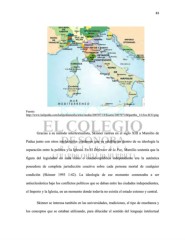 83 Fuente: http://www.kalipedia.com/kalipediamedia/artes/media/200707/18/hisarte/20070718klparthis_14.Ees.SCO.png Gracias a su método intertextualista, Skinner rastrea en el siglo XIII a Marsilio de Padua junto con otros intelectuales coetáneos que ya establecían dentro de su ideología la separación entre la política y la Iglesia. En El Defensor de la Paz, Marsilio sostenía que la figura del legislador en cada reino o ciudad-república independiente era la auténtica poseedora de completa jurisdicción coactiva sobre cada persona mortal de cualquier condición (Skinner 1993 1:42). La ideología de ese momento comenzaba a ser antieclesiástica bajo los conflictos políticos que se daban entre las ciudades independientes, el Imperio y la Iglesia, en un momento donde todavía no existía el estado extenso y central. Skinner se interesa también en las universidades, tradiciones, el tipo de enseñanza y los conceptos que se estaban utilizando, para dilucidar el sentido del lenguaje intelectual
