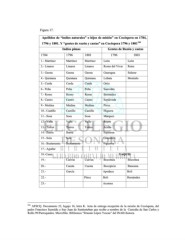 Figura 17. Apellidos de “indios naturales” o hijos de misión” en Cocóspera en 1784, 1796 y 1801. Y “gentes de razón y castas” en Cocóspera 1796 y 1801 166 Indios pimas Gentes de Razón y castas 1784 1796 1801 1796 1801 1.- Martínez Martínez Martínez León León 2.- Linares Linares Linares Romo del Vivar Retes 3.- Gaona Gaona Gaona Guaragua Salazar 4.- Quintana Quintana Quintana Lobata Montaño 5.- Cerda Cerda Cerda Ortiz 6.- Peña Peña Peña Saavedra 7.- Romo Romo Romo Bermúdez 8.- Castro Castro Castro Sepúlveda 9.- Medina Medina Medina Pérez 10.- Castillo Castillo Castillo Higuera 11.- Sosa Sosa Sosa Márquez 12.- Valle Valle Valle Reyes 13.- Torres Torres Torres Acuña 14.- Ibarra Ibarra Espinosa 15.- Sola Sola González 16.- Bustamante Bustamante Figueroa 17.- Aguilar 18.-Casas YAQUIS 19.- Cuevas Cuevas Bocomea Bocomea 20.- Cuesta Cuesta Bocopicio Banouna 21.- García Apodaca Boli 22.- Pérez Boli Hernández 23.- Acamea 166 AFSCQ. Documento 23, legajo 16, letra K. Acta de entrega recepción de la misión de Cocóspera, del padre Francisco Iturralde a fray Juan de Santiesteban que recibe a nombre de la Custodia de San Carlos y Rollo 99/Parroquiales. Microfilm. Biblioteca “Ernesto López Yescas” del INAH-Sonora.