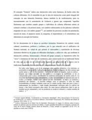 El concepto “frontera” indica una interacción entre seres humanos, de hecho entre dos culturas diferentes. En el entendido de que la idea de interacción como parte integral del concepto de una situación fronteriza, abarca también la de confrontación, pero no necesariamente con la connotación de violencia o guerra que comprende “aquellos fenómenos que resultan cuando grupos o individuos de culturas diferentes entran en contacto continuo y de primera mano, con cambios subsecuentes en los patrones culturales 14, originales de uno o de ambos grupos” , así también los procesos sociales de asimilación, mezcla de razas, el prejuicio racial, la conquista, el imperialismo y el colonialismo son inherentes al concepto de frontera. En los documentos de la época se perciben elementos formativos de carácter social, cultural, económicos, políticos y militares, por lo que coincido con el calificativo de frontera misional, en virtud de que permeó el intercambio y asimilación de diversos elementos distintivos de grupos de diferentes ideologías y estilos de vida, que mediante la interacción continua, intencionada y forzada del grupo europeo, se impusieron sobre los “otros” a instancias de todo tipo de resistencia, para conservación de su tradicional forma de vida, que en aras de su sobrevivencia lograron una adaptación de lo nuevo con lo tradicional, resultando formas distintas de comportamiento social a lo esperado. En todos estos lances y en el de congregar otros gentiles altaneros a las misiones, se acostumbra el proponerle el que se congreguen por medio de algunos de ellos mismos que suelen entrar y salir en las misiones… hablando de indios sin palabra, razón ni cultivo… después que toman posesión en los pueblos y se asegura su estabilidad, se les va catequizando poco a poco, enseñándole los misterios principales de nuestra santa fe. La necesidad del bautismo para administrarse y se les va explorando su voluntad para que lo reciba a su tiempo, cuando estén capaces de este sacramento…se deja a la conducta y prudencia del ministro… al hacerlos trabajar, poco al principio, si ellos no están acostumbrados al trabajo cotidiano como por lo común sucede, hasta que poco a poco y mañosamente les introduce y regla tiempo determinado suficiente para ya cultivar las tierras y den frutos necesarios para todos. En estas nuevas poblaciones todo lo que se siembra sea de comunidad y con sus productos se acuda al vestuario y común sustento de 15 todos […]. 14 Gonzalo Aguirre Beltrán, “Aculturación vs. Asociación: etimología”, Obra Antropológica VI. El proceso de aculturación y el cambio sociocultural (México: Universidad Veracruzana, INI. Gobierno del Estado de Veracruz. FCE, 1992), 11- 14. 15 Archivo franciscano de la Santa Cruz de Querétaro. Documento 14, legajo 14, Informe sobre el nuevo método de gobierno para las misiones de infieles. el padre guardián Romualdo de Cartagena a petición del virrey de la Nueva España Antonio María de Bucareli y Ursúa, fechado en septiembre 30 de 1772. en adelante se citará como AFSCQ.