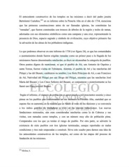 El antecedente constructivo de los templos en las misiones a decir del padre jesuita Bartolomé Castaños, 259 en su informe sobre la Pimería Alta en el año de 1734, menciona que las primeras construcciones antes de ser llamadas iglesias, las constituían las “ramadas”, que fueron construidas con troncos de árboles de la región y techo de ramas, adornadas con sus elementos simbólicos como una campana y una cruz, representando la presencia de Dios, espacio sagrado y símbolo de civilización, cuyo objetivo primario fue la salvación de las almas de los pobladores indígenas. Lo que podemos observar en este informe de 1730 (ver figura 24), es que las comunidades o asentamientos donde fueron erigidas ramadas como un primer paso a la llegada de los misioneros fueron denominados rancherías, es decir no alcanzaban la categoría de pueblos. Otros puntos dignos de mencionar, es que el pueblo de Ati, san Antonio de Oquitoa y santa Teresa, fueron visitas de Tubutama. Además, el pueblo de Ati y las rancherías del Pitiqui y las del Busani, cambiaron su nombre; Los Siete Príncipes de Ati, a san Francisco de Ati, Natividad del Pitiqui por san Diego del Pitiqui, mientras que las rancherías José Maria del Busani y Los Cinco Señores del Busani, se conjuntaron y posteriormente se les llamó san Francisco del Busani. Según el informe, el número de población es aproximado a mil trescientos sesenta y cinco pimas en los pueblos que conformaban en ese entonces la Pimería Alta, cantidad que se supone fue en aumento, en la medida que se fundó el resto de las misiones y se convencía a los indios gentiles de trasladarse a vivir en las nuevas reducciones. Las nuevas fundaciones misionales, aún eran consideradas rancherías como la de Caborca y sus visitas, con ramadas como templos, y con un número muy alto de población pima. Comparados con los que ya tenían el rango de pueblo. Por otra parte, se advierte la existencia de siete pueblos con tres iglesias terminadas, aunque reportadas en malas condiciones y tres más empezadas a construir. Sirva este cuadro para darnos una idea de los antecedentes constructivos de los templos, así como de las etapas del proceso de fundación de las misiones. 259 Molina, 6.