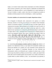 templo y en la misión. Existen muchos factores relacionados con la falta de información sobre el proceso constructivo, pero la única solución es implementar una búsqueda más profunda en los diferentes archivos y acervos bibliográficos de la orden franciscana, en vista que la temática es amplia y aporta varias líneas de investigación que pueden ser abordadas en distintas perspectivas teórico-metodológicas y estudios arqueológicos El carácter simbólico en la construcción de los templos: disposiciones técnicas. En mi búsqueda de información sobre construcción de las iglesias en el archivo franciscano, ubicado en el convento de san Francisco en la ciudad de Celaya Guanajuato. Apareció un documento anónimo, 298 que describe los pasos que deben seguirse para la construcción de una iglesia. Dicho documento, por la sencillez con la que fue escrito y la facilidad de su interpretación, sugiere que cualquier persona que supiera leer y sumar, además de tener experiencia en la construcción, podía fácilmente dirigir la construcción de un templo, desde su trazo y cimentación hasta la decoración de su fachada principal, así como de sus ornamentos interiores. Paso a paso, se describe como realizar el trazo, sus medidas y su proporcionalidad para que quede un templo con un plan cruciforme, es decir con planta de cruz latina, puerta principal, columnas, cornisas, arcos, bóvedas y altar, y si el ingenio del maestro constructor era bueno, podía diseñar una rica y estilizada fachada frontal. Las características del documento por demás sencillas, lo veremos más adelante en el apartado de las disposiciones técnicas, ya que requiere del conocimiento simbólico que encierra para analizarlo en su conjunto, por lo que recomiendo al lector relacionar este apartado con el siguiente. El mencionado documento nos hace reflexionar que intrínsicamente contiene una información que no captamos de primera mano, es decir, encierra algo más profundo que dibujar una serie de líneas o cuadros, para después darles forma sobre la tierra levantando grandes muros de piedra. En ese sentido, al documento se le puede atribuir un carácter simbólico, es decir, nos está diciendo lo que representa, lo 298 AFSCQ. Documento 26, legajo 27, letra K. “Disposiciones para la construcción de una iglesia”. Anónimo y sin fecha