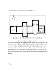 Figura 39. Planta de la iglesia de Tubutama. Fuente: Eckhart, 41. El muro está decorado con una cornisa que simula mármol, muy parecida a la de san Javier del Bac que delimita a la iglesia arriba de la pared. El cilindro octagonal sobre la cruz fue decorado con pinturas al fresco de varios colores, a semejanza de estípites y cortinas con motivos de cruces y otros adornos. Por otro lado los retablos en los transeptos fueron terminados con diversas figuras talladas y pintados blancos (ver figura 40). En el techo se aprecian aún restos de las tallas decorativas originales representando frutas de granada. 318 318 Ibid., 42.