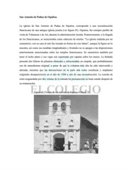 San Antonio de Padua de Oquitoa. La iglesia de San Antonio de Padua de Oquitoa, corresponde a una reconstrucción franciscana de una antigua iglesia jesuita (ver figura 45). Oquitoa, fue siempre pueblo de visita de Tubutama o de Ati, durante la administración Jesuita. Posteriormente, a la llegada de los franciscanos, se mencionaba como cabecera de misión. “La iglesia rodeada por un cementerio, con su cara al este fue trazada en forma de cruz latina”, aunque la figura no lo muestra, asi como sus medidas longitudinales y frontales no se apegan a las disposiciones anteriormente mencionadas sobre los templos franciscanos. Se caracteriza también por tener el techo plano y sus vigas son soportadas por zapatas sobre los muros. La fachada presenta dos hileras de pilastras alineadas y estructuradas en cúspide, que probablemente son de manufactura original, a pesar de que la columna más alta ha sido intervenida y alterada, mientras que las decoraciones de la parte alta como esculturas y emplastes originales desaparecieron en el año de 1950 a raíz de una reconstrucción. La concha de ostra resguardada por dos volutas de la entrada ha permanecido en buen estado después de su restauración. Figura 45. Templo de san Antonio de Oquitoa. Eckhart, 33.