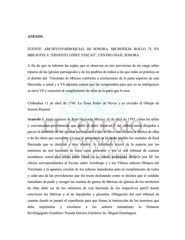ANEXOS. FUENTE: ARCHIVO/PARROQUIAL DE SONORA. MICROFILM, ROLLO 75, EN BIBLIOTECA “ERNESTO LÓPEZ YESCAS”, CENTRO INAH, SONORA. A fin de que se informe las reglas que se observan en mis provincias de mi cargo sobre reparos de las iglesias parroquiales y de los pueblos de indios a las que están en práctica en el distrito del Virreinato de México conforme a resoluciones de la junta superior de esta Hacienda, a usted y a VS adjuntas copias que las comprenden para que en su inteligencia se sirva VS y concurrir al cumplimiento de ellas en la parte que le toca. Chihuahua 11 de abril de 1796. Lo firma Pedro de Neves y es enviado al Obispo de Sonora Rousset Acuerdo 3. Junta superior de Real Hacienda México 16 de abril de 1793. vistas las útiles y convenientes providencias que pidió el señor fiscal en 5 del ultimo enero dirigidos a prever el deterioro de las iglesias parroquiales a que se lleve con eficacia la fabrica de ellas o de las obras que necesiten y a que se caucionen en el modo posible los caudales de Real Hacienda que se destinan a esos objetos, lo informado acerca de la materia por los ministros de real hacienda de estas cajas generales y por el real tribunal de cuentas acordamos como dice dicho señor fiscal en su citado pedimento librán2e por SE los oficios correspondientes al Excmo señor Arzobispo y a los Yllmos señores Obispos del Virreinato y la apertura circular de los señores intendentes para el cumplimiento de todos y cada una de las providencias que les tocan declarando como se declara que el cuidado inmediato de pedir y recoger las cuentas de gastos de fabricas de iglesias de los territorios de ellas debe ser de los ministros de real hacienda de los respectivos parti2 donde estuvieren las fabricas y el de liquidarlas y glosarlas. Obligación del real tribunal de cuentas donde se pasará el expediente para que forme la instrucción de los tesoreros que debe imprimirse y circularse a los señores intendentes lo firmaron Revillagigedo=Gamboa= Posada Herrera Gutiérrez lic. Miguel Domínguez