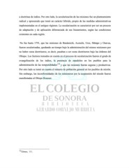 a doctrinas de indios. Por otro lado, la secularización de las misiones fue un planteamiento radical y apresurado que tomó un carácter híbrido, propio de las medidas administrativas implementadas en el antiguo régimen. La secularización se caracterizó por ser un proceso de adaptación y de aplicación diferenciada de sus lineamientos, según las condiciones existentes en cada región. No fue hasta 1791, que las misiones de Banámichi, Aconchi, Ures, Mátape y Onavas, fueron secularizadas, quedando un tiempo bajo la administración del mismo misionero por no haber curas doctrineros, es decir, pasaban a ser curas doctrineros bajo las órdenes del Obispo. Los factores tomados en cuenta en el proceso de secularización fueron el grado de evangelización de los indios, la presencia de españoles en los pueblos para la administración de las temporalidades 132 y que las misiones fueran seguras y productivas. Por otro lado se tomó en cuenta el número de población general en los pueblos de misión. Sin embargo, las inconformidades de los misioneros por la suspensión del sínodo fueron manifestadas al Obispo Rousset. 132 Gómez, 111.