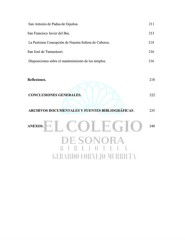 San Antonio de Padua de Oquitoa. 211 San Francisco Javier del Bac. 213 La Purísima Concepción de Nuestra Señora de Caborca. 214 San José de Tumacácori. 216 Disposiciones sobre el mantenimiento de los templos. 216 Reflexiones. 218 CONCLUSIONES GENERALES. 222 ARCHIVOS DOCUMENTALES Y FUENTES BIBLIOGRÁFICAS . 235 ANEXOS. 240