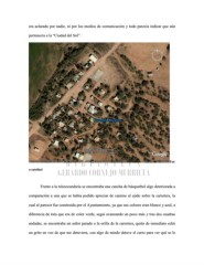 era aclarado por nadie, ni por los medios de comunicación y todo parecía indicar que aún pertenecía a la “Ciudad del Sol”. Fot o satelital Frente a la telesecundaria se encontraba una cancha de básquetbol algo deteriorada a comparación a una que se había podido apreciar de camino al ejido sobre la carretera, la cual al parecer fue construida por el Ayuntamiento, ya que sus colores eran blanco y azul, a diferencia de ésta que era de color verde, seguí avanzando un poco más y tras dos cuadras andadas, se encontraba un señor parado a la orilla de la carretera, quién de inmediato echó un grito en voz de que me detuviera, con algo de miedo detuve el carro para ver qué se le