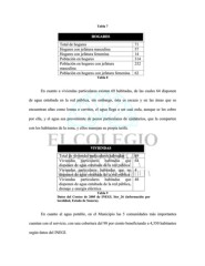 Tabla 7 HOGARES Total de hogares 71 Hogares con jefatura masculina 57 Hogares con jefatura femenina 14 Población en hogares 314 Población en hogares con jefatura 252 masculina Población en hogares con jefatura femenina 62 Tabla 8 En cuanto a viviendas particulares existen 69 habitadas, de las cuales 64 disponen de agua entubada en la red pública, sin embargo, ésta es escaza y en las áreas que se encuentran altas como lomas o cerritos, el agua llega a ser casi nula, aunque se les cobre por ella, y el agua sea proveniente de pozos particulares de ejidatarios, que la comparten con los habitantes de la zona, y ellos manejan su propia tarifa. VIVIENDAS Total de viviendas particulares habitadas 69 Viviendas particulares habitadas que 64 disponen de agua entubada de la red pública Viviendas particulares habitadas que no 4 disponen de agua entubada de la red pública Viviendas particulares habitadas que 48 disponen de agua entubada de la red pública, drenaje y energía eléctrica Tabla 9 Datos del Conteo de 2005 de INEGI. Iter_26 (información por localidad, Estado de Sonora). En cuanto al agua potable, en el Municipio las 5 comunidades más importantes cuentan con el servicio, con una cobertura del 98 por ciento beneficiando a 4,350 habitantes según datos del INEGI.