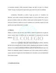 se encontraba retrasada y había ocasionado estragos, que dejó a su paso el ya famoso “tandeo” de agua, el cual generó de igual manera gran controversia entre la ciudadanía. Actualmente, Hermosillo ya recibe el agua que provee el “Acueducto Las Malvinas”, pero existen versiones encontradas respecto a lo qué se debió hacer y qué no para que se hubiera evitado este conflicto y ambas partes salieran ganando. Por lo que se teme que la historia se repita en el caso de continuar con el mercado de agua en la zona agrícola, para seguir abasteciendo a la ciudad. 1.2 Objetivos Debido a lo anterior esta tesis tiene como objetivo: analizar las prácticas de un grupo de actores sociales frente al conflicto que les representaba la construcción de una obra hidráulica. Además de los particulares tales como: conocer el origen del conflicto, identificar qué tipo de movimiento social es, conocer cómo se organizaron para enfrentar el conflicto, además de las acciones y prácticas que realizaron, analizar el tipo de información que se les brindó a los implicados, analizar el tratamiento que le dio la prensa escrita al conflicto y conocer cuál sería el impacto de la obra hidráulica en la vida diaria y en la actividad laboral de los actores sociales. 1.3 Justificación del tema