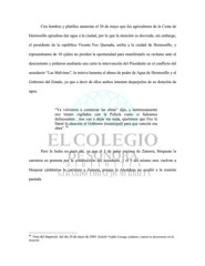 Con bombos y platillos anuncian el 20 de mayo que los agricultores de la Costa de Hermosillo aprueban dar agua a la ciudad, por lo que la atención es desviada, sin embargo, el presidente de la república Vicente Fox Quesada, arriba a la ciudad de Hermosillo, y representantes de 10 ejidos no pierden la oportunidad para manifestarle su reclamo ante el descontento y pidieron mediante una carta la intervención del Presidente en el conflicto del acueducto “Las Malvinas”, la misiva lamenta el abuso de poder de Agua de Hermosillo y el Gobierno del Estado, ya que a decir de ellos ambos intentan despojarlos de su dotación de agua. “Ya volvieron a comenzar las obras” dijo, y lastimosamente nos tienen vigilados con la Policía como si fuéramos delincuentes…nos van a dejar sin nada, queremos que Fox le llamé la atención al Gobierno (municipal) para que cancele esa 90 obra”. Pero la lucha no paró ahí, ya que el 3 de junio vecinos de Zamora, bloquean la carretera en protesta por la construcción del acueducto, y el 9 del mismo mes vuelven a bloquear ejidatarios la carretera a Zamora, porque la Alcaldesa no acudió a la reunión pactada. 90 Nota del Imparcial del día 20 de mayo de 2005. Rodolfo Trujillo Careaga, ejidatario, expresó su descontento con la situación.