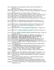 Lara, S. (2006, Mayo 13). "Culpan ejidos de escasez a obra de 'Las Malvinas'". El Imparcial , p. 1B. Lara, S. (2005, Abril 8). "Demandan a ejidatarios por obra". El Imparcial , p. 4A. Lara, S. (2005, Octubre 26). "Descartan a corto plazo obra de desalinizadora". El Imparcial , p. 1A. Lara, S. (2005, Septiembre 30). "En estudio el tandeo". El Imparcial , p. 1A. Lara, S. (2005, Enero 31). "Endurecen postura ejidatarios". Periódico El Imparcial , p. 2A. Lara, S. (2005, Octubre 24). "Es desalinizadora opción de abasto". El Imparcial , p. 1A. Lara, S. (2006, Mayo 16). "Está Aguahh abierta al diálogo". El Imparcial , p. 6B. Lara, S. (2005, Marzo 18). "Hay fuentes de abasto que garantizan servicio". El Imparcial , p. 2A. Lara, S. (2005, Mayo 5). "Mantendrán lucha contra acueducto". El Imparcial , p. 2A. Lara, S. (2005, enero 18). "Pelean por agua hermosillenses". Periódico El Imparcial , p. 1A. Lara, S. (2006, 14 Mayo). "Preocupa reclamo por falta de agua". El Imparcial , p. 3B. Lara, S. (2006, Mayo 18). "Prevém resolver en Los Bagotes en nivel de Flúor". El Imparcial , p. 1B. Lara, S. (2005, Septiembre 18). "Prevén posibilidad de ampliar tandeo". El Imparcial , p. 5A. Lara, S. (2005, Enero 2). "Propone Aguahh obra a ejidatarios". Periódico El Imparcial , p. 1A. Lara, S. (26 de enero de 2005). "Rechazan ejidataarios negociar uso del agua". Periódico El Imparcial , pág. 5A. Lara, S. (2005, Mayo 5). "Reclaman ejidatarios trato diferente". Chávez Mada , p. 1A. Lara, S. (2005, Enero 23). "Requiere ciudad acueducto". Periódico El Imparcial . Lara, S. (2006, Mayo 13). "Resurge protesta". El Imparcial , p. 1B. Lara, S. (2005, enero 18). "Temen quedarse sin agua". Periódico El Imparcial , p. 8A. Lara, S. (enero de 2005). "Vigilan que no continue la obra". Periódico El Imparcial . Lara, S., & Arredondo, L. (2005, Marzo 18). "Descarta 'reversazo' en el tandeo de agua". El Imparcial , p. 2A. Laraña, E., & Gusfield, J. (2001). "Los nuevos movimientos sociales". España: Graficas Areas Montaño S.A. Laraña, E., & Gusfield, J. (2001). Los Nuevos Movimientos Sociales. De la ideología a la identidad. Madrid: Academia. Centro de Investigaciones Sociólogicas. Leñero, V., & Marín, C. (1999). "Manual de Periodismo". México: Grijalbo . Lewicki, S., & Minton, J. (1999). Negotiation. Singapure: McGraw-Hill Internarional Editions. López, A. (2005, Mayo 20). "Piden ejidatarios ayuda al Presidente". El Imparcial , p. 2A. López, A. (2005, Marzo 27). "Se acabó el agua iniciará el tandeo". El Imparcial , p. 1A. Luis, L. S. (2005, enero 20). "Rechazan negociar ejidatarios con aguahh" . Periódico El Imparcial , p. 2A. Maharishi, M. Y. (1976). Creating an ideal society: A Global undertaking. Germany: Maharishi European Research University Press. Maharishi, M. Y. (1978). Enlightenmente to every individual and invincibility to every nation Rheinweiler. Germany: Mahasishi European Research University Press. Manjarrez, A., & Corral, N. (2005, Marzo 15). "Afectará tandeo a las empresas". Periódico El Imparcial , p. 2A.