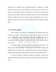 afirmaron que la competición entre los grupos dominantes y dominados se extendía también al ámbito del poder y del privilegiado. De acuerdo con ello, la vida social es un reflejo de la competición de grupos que rivalizan por el control de los recursos sociales (riqueza, poder y privilegio). Dado que la cantidad de recursos que existe es necesariamente limitada, el problema del reparto trae consigo siempre enfrentamientos entre los que se apropian de la mayor parte y los que se sienten perjudicados (Javaloy, Rodríguez, & Espelt, 2001). 2.1.1 Teoría del conflicto: Toda sociedad es un escenario de enfrentamientos entre diferentes grupos que rivalizan por el control de recursos limitados (riqueza, poder, prestigio). La vida social genera inevitablemente división de intereses, metas opuestas y conflictos. Los conflictos son normales y pueden ser benéficos. El cambio es inevitable e incluso deseable (Gelles & Levine, 1995). El conflicto se debe a una gran divergencia de necesites entre dos partes o a un desacuerdo entre dos o más personas. El conflicto puede ocurrir cuando dos partes están trabajando hacia las mismas metas y generalmente quieren los mismos resultados, o también cuando ambas partes quieren una diferente solución (Lewicki & Minton, 1999). La tarea del sociólogo es identificar los intereses que compiten y mostrar cómo mantienen su posición los que están en el poder a través de la represión (Gelles & Levine, 1995).
