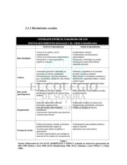 2.1.3 Movimientos sociales CONTRASTE ENTRE EL PARADIGMA DE LOS NUEVOS MOVIMIENTOS SOCIALES Y EL VIEJO PARADIGAMA NUEVO PARADIGMA VIEJO PARADIGMA Crítica de la cultura y de la Conformismo cultural modernización Conformismo con democracia Crítica de la democracia representativa representativa Base ideológica Orientación a valores generales y Orientación a ideología en sentido objetivos concretos tradicional (conservador-liberal; izquierda-derecha) Autonomía personal e identidad, en Libertad y seguridad en el consumo oposición al control centralizado privado y progreso material Posmaterialismo: derechos humanos, Materialismo: crecimiento económico y Valores paz, comunidad, calidad de vida, trabajo distribución: seguridad militar y social; no alienante control social Motivación hacia los bienes colectivos Motivación hacia el interés individual No estructura de clase, aunque Estructura clase. Clases desfavorecidas Base social predominan miembros de nuevas clases económicamente (participantes) medias Redes de interacción informal Estructuras formales de interacción Estructura organizacional Organización centralizada, jerárquica descentralizada, anti jerárquica, Partidos y sindicatos de clase Organización asamblearia Asociaciones horizontales que practican la democracia directa Política de protesta, basada en términos Confrontación entre partidos políticos, predominantemente negativos regla de mayoría Acciones para influir en público y Oposición a la acción directa Formas de acción gobernantes Acciones espectaculares que atraigan la atención de los medios de comunicación Tabla 1 Fuente: Elaboración de JAVALOY, RODRÍGUEZ Y ESPELT, teniendo en cuenta las aportaciones de Offe 1990; Dalton y otros 1990, 30-35; Klandermans 1986, 20-21; Johnston y otros 1994;6-7 y Cohen 1985).