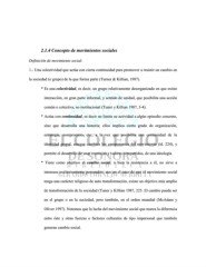 2.1.4 Concepto de movimientos sociales Definición de movimiento social: 1.- Una colectividad que actúa con cierta continuidad para promover a resistir un cambio en la sociedad (o grupo) de la que forma parte (Turner & Killian, 1987). * Es una colectividad, es decir, un grupo relativamente desorganizado en que existe interacción, en gran parte informal, y sentido de unidad, que posibilita una acción común o colectiva, no institucional (Tuner y Killian 1987, 3-4). * Actúa con continuidad, es decir no limita su actividad a algún episodio concreto, sino que desarrolla una historia; ellos implica cierto grado de organización, estrategia, compromiso, etc., a la vez que posibilita una continuidad de la identidad grupal, aunque cambien los componentes del movimiento (id. 224), y permite el desarrollo de unas creencias y valores compartidos, de una ideología. * Tiene como objetivo el cambio social, o bien la resistencia a él, no sirve a intereses exclusivamente personales; aun en el caso de que el movimiento social tenga una carácter religioso de auto transformación, existe un objetivo más amplio de transformación de la sociedad (Tuner y Killian 1987, 225. El cambio puede ser en el grupo o en la sociedad, pero también, en el orden mundial (McAdam y Oliver 1997). Notemos que la lucha del movimiento social que marca la diferencia entre éste y otras fuerzas o factores culturales de tipo impersonal que también generan cambio social.