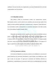 cambiarla. Convencer de ellos a los simpatizantes es una tarea fundamental de los activistas comprometidos con el movimiento. 2.1.8 Identidad colectiva Para Melucci (1989) los movimientos sociales son construcciones sociales. Movimientos sociales y acción colectiva son concebidos como procesos por medio de los cuales los actores producen significados, comunican entre sí, negocian y toman decisiones. Los movimientos sociales contemporáneos se encuentran sumergidos en las redes sociales de la vida cotidiana (Laraña & Gusfield, 2001). Desarrollar una identidad colectiva significa que uno mismo se ha definido como un grupo, y que ha desarrollado concepciones del mundo, metas y opiniones compartidas sobre el entorno social y las posibilidades y límites de la acción colectiva. Los grupos pueden tener más o menos éxito a la hora de desarrollar su identidad colectiva. Si un grupo no lo logra, no podrá llevar a cabo ninguna acción colectiva (Laraña & Gusfield, 2001). 2.1.9 La conciencia colectiva En la teoría de Maharishi, la conciencia colectiva es la totalidad de la conciencia de grupo formada por las conciencias individuales, lo que da lugar a una entidad que es más que la suma de sus partes. Al igual que la conciencia del individuo determina su pensamiento y comportamiento, la conciencia colectiva de la sociedad gobierna la actividad