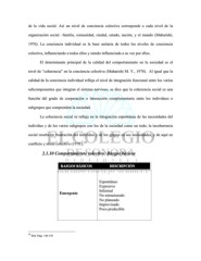 de la vida social. Así un nivel de conciencia colectiva corresponde a cada nivel de la organización social –familia, comunidad, ciudad, estado, nación, y el mundo (Maharishi, 1976). La conciencia individual es la base unitaria de todos los niveles de conciencia colectiva, influenciando a todos ellos y siendo influenciada a su vez por ellos. El determinante principal de la calidad del comportamiento en la sociedad es el nivel de “coherencia” en la conciencia colectiva (Maharishi M. Y., 1978). Al igual que la calidad de la conciencia individual refleja el nivel de integración funcional entre los varios subcomponentes que integran el sistema nervioso, se dice que la coherencia social es una función del grado de cooperación o interacción complementaria entre los individuos o subgrupos que comprenden la sociedad. La coherencia social se refleja en la integración espontánea de las necesidades del individuo y de los varios subgrupos con los de la sociedad como un todo; la incoherencia social resulta en frustración del individuo y de los grupos en sus necesidades, y de aquí en 10 conflicto y stress colectivo (1978:). 2.1.10 Comportamiento colectivo: Rasgos básicos RASGOS BÁSICOS DESCRIPCIÓN Espontáneo Expresivo Emergente Informal No estructurado No planeado Improvisado Poco predecible 10 Ibíd. Págs. 146-156