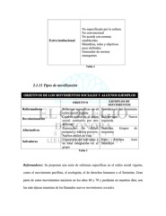 No especificado por la cultura No convencional No acorde con normas Extra institucional establecidas Miembros, roles y objetivos poco definidos Generador de normas emergentes Tabla 2 2.1.11 Tipos de movilización OBJETIVOS DE LOS MOVIMIENTOS SOCIALES Y ALGUNOS EJEMPLOS OBJETIVO EJEMPLOS DE MOVIMIENTOS Reformadores Reformas específicas en el Derechos civiles. Feminista orden social vigente Cambio radical en el orden Bolchevique. Nueva Revolucionarios social: sustituirlo por otro izquierda diferente Corrección de déficit Naturista. Grupos de Alternativos personal y hábitos nocivos. encuentro Nuevos estilos de vida Conversión del individuo y Hare Krishna. Aum Salvadores su total integración en el Shinrikyo grupo Tabla 3 Reformadores: Se proponen una serie de reformas específicas en el orden social vigente, como el movimiento pacifista, el ecologista, el de derechos humanos o el feminista. Gran parte de estos movimientos nacieron en los años 60 y 70 y perduran en nuestros días; son las más típicas muestras de los llamados nuevos movimientos sociales.
