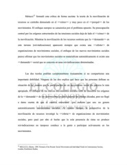 12 Melucci formuló esta crítica de forma sucinta: la teoría de la movilización de recursos se centraba demasiado en el <> y muy poco en el <> de los movimientos. El enfoque europeo se caracteriza por el problema opuesto. Su preocupación central por los orígenes estructurales de las tensiones sociales deja de lado el <> de la movilización. Mientras la movilización de los recursos sostiene que la <> en este terreno (reivindicaciones) aparecerá siempre que exista una <> de organizaciones de movimientos sociales, el enfoque de los nuevos movimientos sociales parece afirmar que los movimientos sociales se materializan automáticamente si existe una <> social que se concreta en unas reivindicaciones determinadas. Las dos teorías podrían complementarse mutuamente si no compartieran una importante debilidad. Ninguna de las dos explica qué hace que las personas definan su situación de tal manera que la participación en un movimiento social les parezca lo más apropiado. El enfoque de los nuevos movimientos sociales trató de descubrir los orígenes de la <> de los movimientos sociales durante las últimas décadas, pero no llegó a darse cuenta de que el cambio estructural –por molesto que sea- no genera automáticamente movimientos sociales. Al mismo tiempo, la perspectiva de la movilización de recursos investigó la <> de organizaciones de movimientos sociales, pero pasó por alto el hecho que la sola presencia de éstas no produce reivindicaciones no tampoco conduce a la gente a participar activamente en los movimientos. 12 MELUCCI, Alberto. 1989. Nomads of the Present: Social Movements and Individual Needs in Contemporary Society, London, Hutchinson Radius.