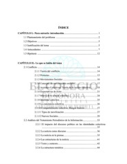 ÍNDICE CAPÍTULO I.- Para entrarle: introducción ....................................................... 1 1.1 Planteamiento del problema .................................................................... 2 1.2 Objetivos .................................................................................................. 5 1.3 Justificación del tema .............................................................................. 5 1.4 Antecedentes ............................................................................................ 7 1.5 Hipótesis ................................................................................................ 12 CAPÍTULO II.- Lo que se habla del tema 2.1 Conflicto ................................................................................................ 14 2.1.1 Teoría del conflicto ............................................................ 14 2.1.2 Protestas ............................................................................. 15 2.1.3 Movimientos Sociales ....................................................... 16 2.1.4 Concepto de movimientos sociales.................................... 17 2.1.5 Acciones Colectivas: Teoría de la acción colectiva .......... 18 2.1.6 Expectativas de éxito ......................................................... 21 2.1.7 Marco de la acción colectiva ............................................. 24 2.1.8 Identidad colectiva ............................................................. 25 2.1.9 La conciencia colectiva ..................................................... 26 2.1.10 Comportamiento colectivo: Rasgos básicos .................... 27 2.1.11 Tipos de movilización ..................................................... 27 2.1.12 Nuevos Sociales ............................................................... 29 2.2 Análisis del Tratamiento Periodístico de la Información ....................... 33 2.2.1 El impacto del discurso político en las identidades colectivas ......................................................................................... 35 2.2.2 La noticia como discurso ................................................. 36 2.2.3 La noticia en la prensa ...................................................... 35 2.2.4 Las estructuras de la noticia ............................................. 41 2.2.5 Texto y contexto ............................................................... 42 2.2.6 La estructura temática ...................................................... 44