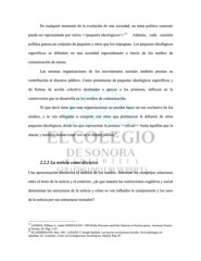 En cualquier momento de la evolución de una sociedad, un tema político concreto 21 puede ser representado por varios <>. Además, cada cuestión política genera un conjunto de paquetes y otros que los impugnan. Los paquetes ideológicos específicos se difunden en una sociedad especialmente a través de los medios de comunicación de masas. Las mismas organizaciones de los movimientos sociales también prestan su contribución al discurso público. Como promotoras de paquetes ideológicos específicos y de formas de acción colectiva destinadas a apoyar a los primeros, influyen en la controversia que se desarrolla en los medios de comunicación. Ni que decir tiene que esas organizaciones no pueden hacer un uso exclusivo de los medios, y se ven obligadas a competir con otras que promueven la difusión de otros paquetes ideológicos, desde las que representan la postura <> hasta aquéllas que la 22 atacan y también desean tener voz en el debate público . 2.2.2 La noticia como discurso Una aproximación discursiva al análisis de los medios. Interesan las complejas relaciones entre el texto de la noticia y el contexto: ¿de que manera las restricciones cognitiva y social determinan las estructuras de la noticia y cómo se ven influidos la comprensión y los usos de la noticia por sus estructuras textuales? 21 GAMSOJ, William A.; Andre MODIGLIANI. 1989.Media Discourse and Pulic Opinion on Nuclear power, American Journal of Society, 95: Págs. 1-38 22 KLANDERMANS, Bert, 2001. LARAÑA Y Joseph Gusfield. Los nuevos movimientos Sociales. De la ideología a la identidad. Ed. Academia. Centro de Investigaciones Sociológicas. Madrid. Pág.187