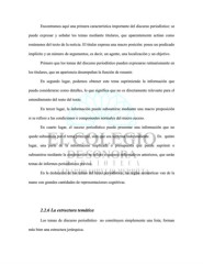 Encontramos aquí una primera característica importante del discurso periodístico: se puede expresar y señalar los temas mediante titulares, que aparentemente actúan como resúmenes del texto de la noticia. El titular expresa una macro posición: posee un predicado implícito y un número de argumentos, es decir, un agente, una localización y un objetivo. Primero que los temas del discurso periodístico pueden expresarse rutinariamente en los titulares, que en apariencia desempeñan la función de resumir. En segundo lugar, podemos obtener este tema suprimiendo la información que pueda considerarse como detalles, lo que significa que no es directamente relevante para el entendimiento del resto del texto. En tercer lugar, la información puede subsumirse mediante una macro proposición si se refiere a las condiciones o componentes normales del macro suceso. En cuarto lugar, el suceso periodístico puede presentar una información que no quede subsumida por el tema principal, sino que sea subtema independiente. En quinto lugar, una parte de la información implicada o presupuesta que puede suprimir o subsumirse mediante la construcción se refiere a sucesos informativos anteriores, que serán temas de informes periodísticos previos. En la deducción de los temas del texto periodístico, las reglas semánticas van de la mano con grandes cantidades de representaciones cognitivas. 2.2.6 La estructura temática Los temas de discurso periodístico no constituyen simplemente una lista; forman más bien una estructura jerárquica.