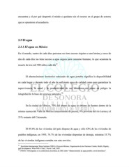 encuentra y el por qué despertó el miedo a quedarse sin el recurso en el grupo de actores que se opusieron al acueducto. 2.3 El agua 2.3.1 El agua en México En el mundo, cuatro de cada diez personas no tiene acceso siquiera a una letrina y cerca de dos de cada diez no tiene acceso a agua segura para consumo humano, lo que ocasiona la 37 muerte de tres mil 900 niños cada día . El abastecimiento doméstico adecuado de agua potable significa la disponibilidad en cada hogar y durante todo el año de suficiente agua de calidad como para garantizar la supervivencia, la salud y la productividad de sus miembros sin poner en peligro la 38 integridad de la base de recursos naturales. En la ciudad de México, 70% del abasto de agua se obtiene de fuentes dentro de la misma cuenca del Valle de México (mayormente de pozos), 9% proviene del río Lerma y el 21% restante del Cutzamala. El 85.6% de las viviendas del país dispone de agua y sólo 62% de las viviendas de pueblos indígenas; en 1995, 74.7% de las viviendas disponían de drenaje, mientras 33.7% de las viviendas indígenas contaba con este servicio. 37 Stockholm Internacional Water Institute (SIWI) y Proyecto Milenio, Organización de las Naciones Unidas, Health, Dignity, and Development: What Will it Take?, Nueva York, 2005. 38 UNICEF. Participantes en la conferencia electrónica de 2002 sobre “Abastecimiento de agua potable a nivel doméstico”.