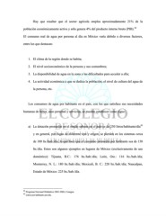 Hay que resaltar que el sector agrícola emplea aproximadamente 21% de la 42 población económicamente activa y sólo genera 4% del producto interno bruto (PIB). El consumo real de agua por persona al día en México varía debido a diversos factores, entre los que destacan: 1. El clima de la región donde se habita; 2. El nivel socioeconómico de la persona y sus costumbres; 3. La disponibilidad de agua en la zona y las dificultades para acceder a ella; 4. La actividad económica a que se dedica la población; el nivel de cultura del agua de la persona, etc. Los consumos de agua por habitante en el país, con los que satisface sus necesidades humanas de beber, aseo personal y servicios, se pueden establecer como sigue: 43 a) La dotación promedio en el medio urbano en el país es de 250 litros/habitante/día y en general, por fugas de diferente tipo y origen, se pierden en los sistemas cerca de 100 lts./hab./día, lo que hace que el consumo promedio por habitante sea de 150 lts./día. Estos son algunos ejemplos en lugares de México (exclusivamente de uso doméstico): Tijuana, B.C.: 176 lts./hab./día; León, Gto.: 116 lts./hab./día; Monterrey, N. L.: 180 lts./hab./día; Mexicali, B. C.: 220 lts./hab./día; Naucalpan, Estado de México: 225 lts./hab./día. 42 Programa Nacional Hidráulico 2001-2006, Conagua. 43 Litros por habitante por día.