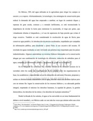 En México, 50% del agua utilizada en la agricultura para irrigar los campos se escurre y se evapora. Afortunadamente, la tecnología y las estrategias de conservación para reducir la demanda del agua han empezado a cambiar; en lugar de construir diques y represas de gran escala, costosos y a menudo ineficientes, se está reconociendo la importancia de nivelar la tierra para minimizar la escorrentía, el riego por goteo, que virtualmente elimina el desperdicio, y el uso de aspersores de baja presión que evitan el riego excesivo. También se está considerando la recolección de agua de lluvia para conservar agua potable y la introducción de precios escalonados, respaldados por campañas de información pública, para desalentar y poner freno al uso excesivo del recurso. El reciclado de aguas residuales se está volviendo una práctica muy importante para los países industrializados. Algunos especialistas en recursos hídricos interesados en la conservación abogan por una combinación de tecnología de eficiencia, reducción de subsidios para el 46 agua, campañas de información pública y programas de ayuda mejor dirigidos. En la búsqueda de soluciones hay muchas iniciativas de distintos sectores de la sociedad, entre los cuales las organizaciones de la sociedad civil, las organizaciones de base, los académicos y especialistas no son la excepción en esta tarea. Discuten, proponen y actúan en distintos temas relacionados con el agua, muchas veces con distintas ópticas pero con un mismo fin: lograr la conservación de los recursos hídricos y su adecuada gestión integral, respetando al máximo los derechos humanos, la equidad de género, la gestión 47 democrática, los derechos de las etnias y los derechos de la propia naturaleza. Desde la década de los setenta, el agua se ha convertido en un tema fundamental de debate a nivel mundial, y en México cada vez son más las voces que alertan sobre una crisis 46 Polly Ghazi, “Sin desperdicio”, en Nuestro Planeta, tomo 14, núm. 1, Programa de las Naciones Unidas para el Medio Ambiente, p. 29, www.ourplanet.com/imgversn/141/spanish/images/Our%20Planet%2014.1%20Spanish.pdf (consulta: 6 enero de 2006). 47 http://www.cemda.org.mx/artman/uploads/agua-mexico_001.pdf